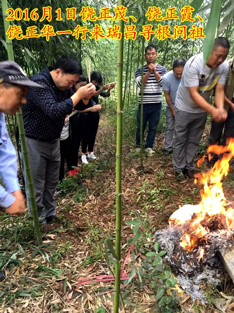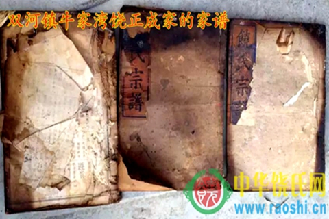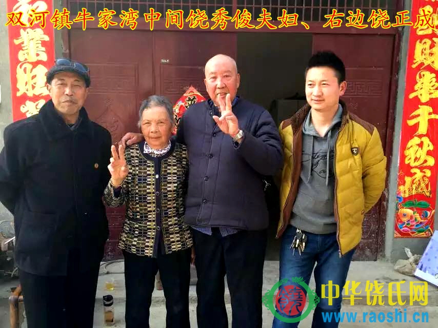 等我们赶到双河镇,已经是下午二点半。跟饶政成联系上后,得知我们还没吃中午饭,他热情的请我们吃饭,在交谈当中,得知他的辈分派行跟我们一样,但是他只知道上三代以及下面的辈分,他说家里有家谱,我们当时就很激动,叫他带我们去他家。我们吃完饭立即前往离双河镇几公里的牛家湾老家,饶政成把家谱搬出来给我们看,听政成家人讲,以前破四旧时候家谱都被烧了,在烧的时候被祖上老人从火堆抢回了这些(共计13本),保留至今。此时此刻,大家的心情很是沉重。我们把从家里带过来家谱与这些谱小心翼翼的对照,边看边嘱咐他们要保管好家谱,这是我们饶家的历史文献。在场的宗亲一边对照宗谱,一边激动的说,两地的族谱是一模一样的。我们这次到牛家湾,也碰到了刚好从北京回老家的饶秀俊夫妇(大概七、八十岁),我们向他了解家族方面的情况,老人家告诉我们说:“祖辈传下来说是从江西迁来的老四房”,我们大家高兴的不得了,从各方面都印证,这支家人就是从瑞昌绣球庄迁出。而且,我还发现牛家湾地理环境跟我们老家瑞昌绣球庄的地理环境极其相似,连风俗习惯、丧葬礼仪、称呼等都几乎一致。