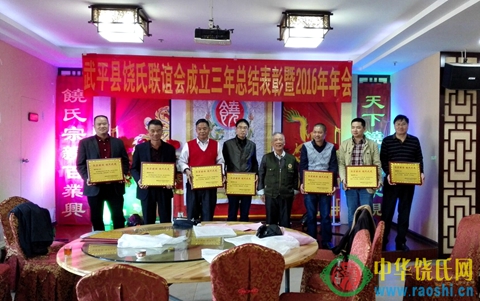 各位宗亲,我们的联谊会三年来做了一些工作,取得了一些成绩。这些成绩的取得,如果没有广大饶氏宗亲的给力支持将一事难成,三年联谊活动中涌现了一批先进的宗亲,他们是:添荣、金灿、英俊、衍添、华昌、衍银、衍鹏、饶英、树考、育梅、金梅、金锋、兆升、英豪、养莲等15位宗亲,他们中有的慷慨解囊捐款支持饶氏联谊活动,有的是自己积极支持和热情参加各项联谊活动,有的是积极带领基层饶氏组织一班人积极支持各项饶氏联谊活动。今天,我们在这次大会上予以表彰,特发给“敦宗睦族,饶氏之光”的牌匾,感谢以上宗亲对我县饶氏事业做出的突出贡献!