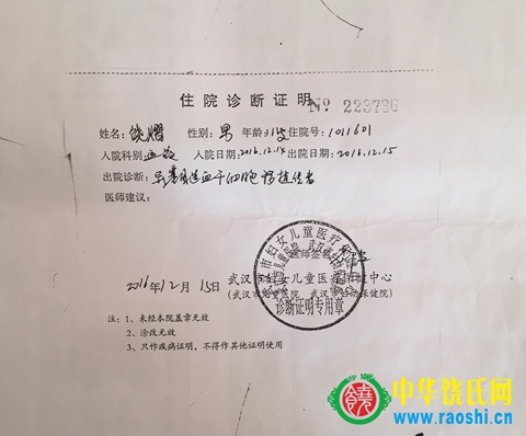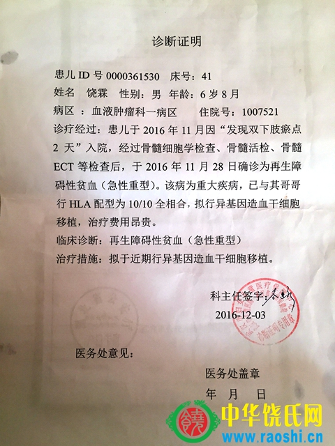 2016年11月20日晚,二儿子饶霖在洗澡时,他奶奶发现饶霖的腿上有很多紫点。第二天,我们带饶霖到梅川二医院检查血常规,查三次都没显示。后来转院到武穴市第一人民医院,可医院血库没有血小板,急转武汉儿童医院,最终被武汉儿童医院确诊为“再生障碍性贫血”。这一突如其来的消息,犹如五雷轰顶,一下子把我们全家击落到万丈深渊里。医生说,这病很严重,需要干细胞移植,才有一线希望,而且费用很高。