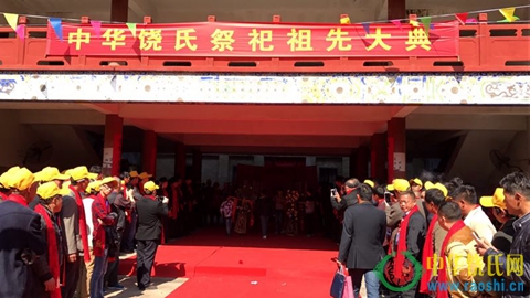 由于准备工作做得细致、完善,使公祭活动得以如期顺利进行。4月2月(农历三月初六)正式举行公祭,参加公祭的宗亲来自全国四面八方,有安徽六安、霍山、金寨的,有江西鄱阳、瑞昌、九江的,有贵州贵阳的,有湖北武汉、黄石、阳新、英山、蕲春的。远地的宗亲有的于4月1日就赶到饶明道庄,有的于4月2日当天凌晨就驱车赶往。所有参与公祭的宗亲于上午八点半就全部到齐,共一千余人。九时整,公祭正式开始,在饶政蠡的主持下,公祭大会的主事人员全部就位,由礼仪组饶惠权叫礼,礼生举行祭拜仪式。大冶饶祟和、英山饶惠文诵读祭文。然后各庄各支依次高举饶氏旗帜,整队进入祠内祭拜。