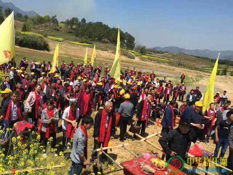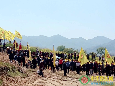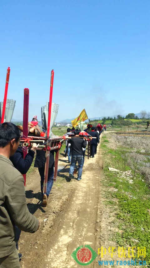 宗祠祭拜完毕后,各庄各支高举饶氏旗帜,依次整队步行至十几里外的先祖墓地扫墓祭拜。一路上旗帜飘扬,抬着供品,队形整齐,锣鼓喧天,鞭炮动地。真个是声势浩大,阵容壮观,引得路人赞声不断。