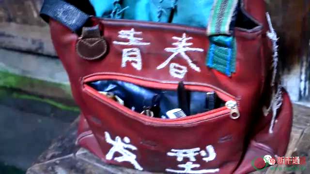 这个背包是饶福林捡来的,他乐呵呵的说,背包虽小,却陪伴了他很多年,里面的剪发工具一应俱全。青春发型的字是饶福林自己缝上去的,让这个古董包洋溢了现代时尚的元素。