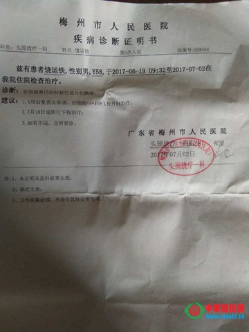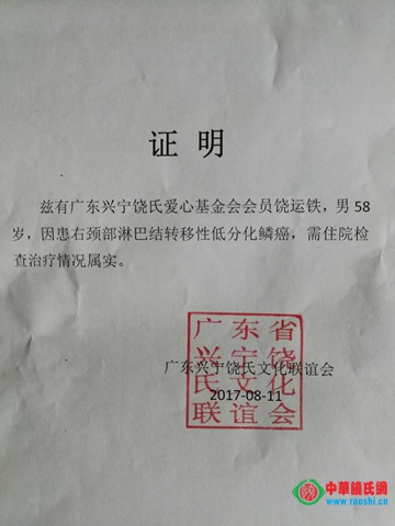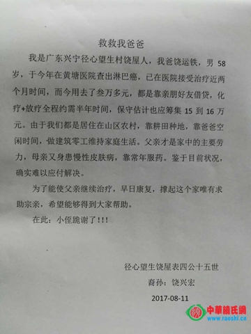 我是广东兴宁径心望生村饶屋饶兴宏,每月收入1500,我爸饶运铁于今年在黄塘医院查出淋巴癌,已在医院接受治疗近两月时间,现入院住黄塘人民医院肿瘤科402房8号床,至今用去了3万多元,都是靠亲朋好友借贷,化疗加放疗全程约半年时间,保守估计也需筹集15-16万元。由于我们都是居住在山区农村,靠耕田种地。平时靠爸爸空闲时间做建筑零工维持家庭生活。父亲是家中的主要劳力,母亲又患慢性皮肤病,靠常年服药。
