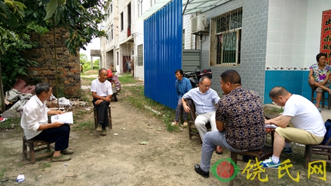 事先由饶扬威宗亲联系到了饶家湾的饶国华宗亲,他来到镇上把我们带到饶家湾。先在一位宗亲家中坐下喝茶,交流族事。得知他们此处及附近的村庄约有饶氏六、七百人,祠堂、族谱已经没有了。但在交谈的过程中,他们说在附近的碾盘村可能有族谱留存。于是,我们邀请饶明耀、饶国华宗亲一同立刻前往碾盘村。