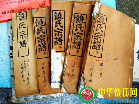 吃完中午饭,老人带着我们来到离饭店不远处,原来这里就是饶朝善宗亲的家。我们向饶朝善宗亲介绍我们自己以及中华饶氏文化研究中心的情况,并说明来意。饶朝善宗亲没有多说什么,就进去抱出一大叠族谱资料,让我们拍摄。饶朝善宗亲处的族谱共有6册,另有几册是他自己整理的。经过仔细翻看,根据题名、字体等等情况,我们初步判断这6册族谱应该是不同版本,其中一套4册是民国三十五年出版的《鲁阴堂饶氏宗谱》,另一套2册据说是民国二十五年的,但我们表示存疑,因为三十五年这套是明确的,两个修次不可能仅间隔十年,或许是民国五年,这需要进一步的确认。经过交流,得知饶朝善宗亲对族谱十分热心,在没有经费没有帮助的情况下,自己用了几年的时间,对老谱进行了整理,对现有的人丁情况进行了记录,整理出两册手抄的族谱资料,他在自己装订而成的资料序言中写道:受笔者文化水平和经济能力所限……闲暇之际,略尽余辉……此卷宗只作为饶门人流传记载,盼有爱好者接此、待续……。