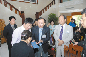 昨日,韩国卢氏中央宗亲会代表团一行26人前来我市卢宅寻根祭祖、参观访问,并兴致勃勃游览卢宅古建筑群和走进市民家开展民间文化交流。据了解,浙江东阳卢氏与韩国卢氏有着悠久的渊源,从2001年起,两地民间组织每年开展交流走访活动。图一为代表团成员正在我市卢氏后人的陪同下游览卢宅古建筑群。图二为代表团向卢氏后人一户人家赠送礼品。