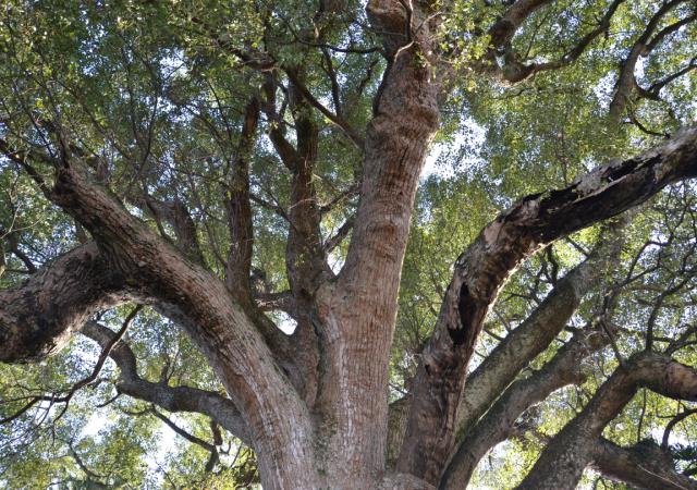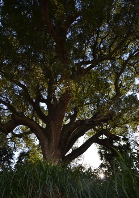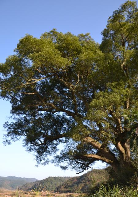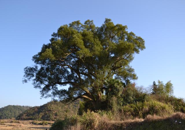 大樟树,在江南一带颇为常见,我们家乡也有不少硕大的千年老樟树,传说有树才有村,才会有适合人生活发展的环境,因此,许多树边都有樟树,甚至有些人把樟树认作“娘”,俗称“樟树娘”。这颗与我们饶氏祖先有关的樟树,位于珀玕平坦田野的尽头,依偎在小山脚,在远处观看,感觉没有想像中的那么高大。