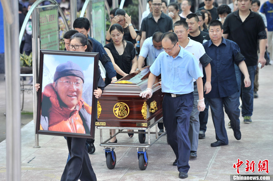 中国登山家饶剑峰在巴基斯坦遭遇恐怖袭击不幸遇难。6月30日,深圳社会各界人士在沙湾殡仪馆大礼堂举行登山家饶剑峰追悼会,众多山友追思道别登山勇士。中新社发 陈文 摄