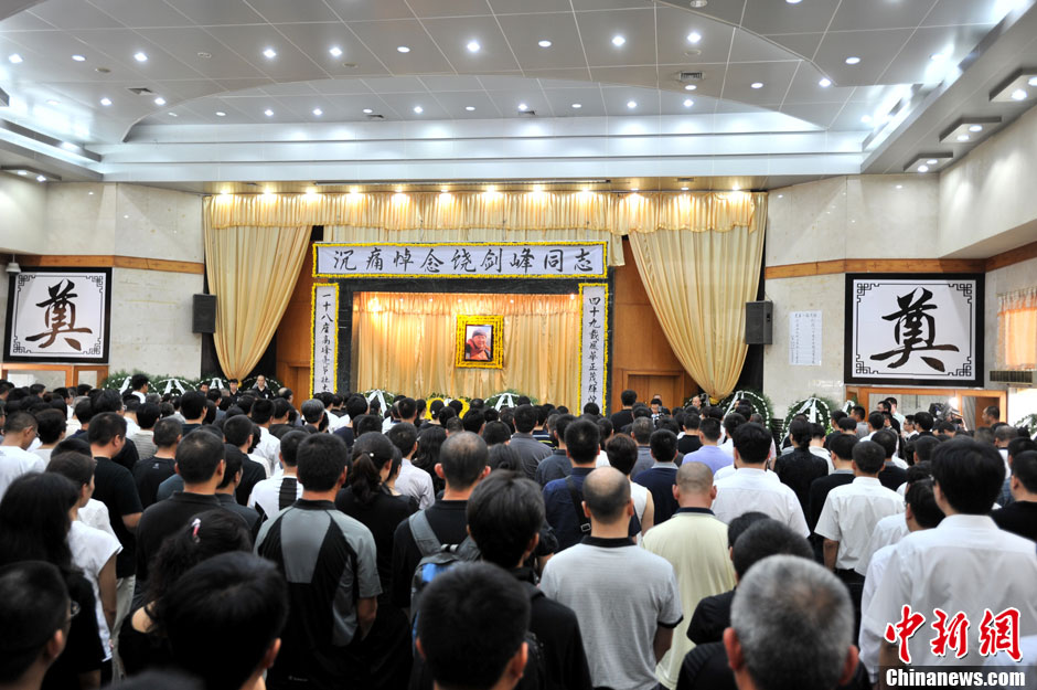 巴基斯坦驻广州总领事馆官员阿里等来宾,与饶剑峰的生前好友近千人共同出席。礼堂内摆放着饶剑峰生前在雪山中微笑的照片,以及挽联“四十九载风华正茂辉煌已臻成绝响,一十八座高风亮节壮志未酬竟永诀”。饶剑峰的父母、妻子和女儿送来的花圈,摆放在遗照前方,饶夫人米女士在献给丈夫的花圈中写道“孕中泣挽”。晶报社等单位,也敬献了花圈。