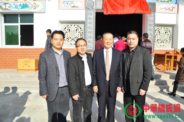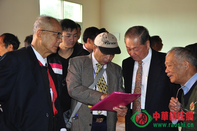 与饶颖奇宗亲合影,左起:饶恩强、饶玉华、饶颖奇、饶旭华