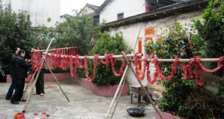 到了农历节日前几天,最热闹的就是碓寮了,这时候,家家户户都预先浸好米、麦等用竹器盛着,排队放在碓寮边。轮到时就要有两个人操作,一人踏碓,一人翻米、筛米粉。从大清早到晚上,碓寮里的踏碓声都一直响着。那些碓好米粉的人家则正在蒸甜粄、发粄整个大屋到处飘着年糕的香味。清明节蒸的是糯米粉和着艾叶等青草药的米粄,春节蒸的多是粳米的发粄和糯米甜粄、年糕。好多童年的美好记忆永远留在我们的脑海里。