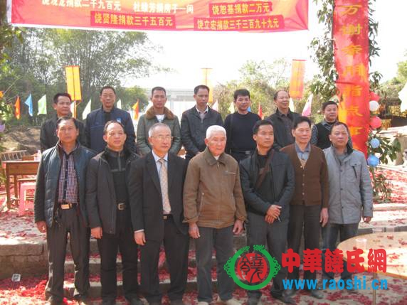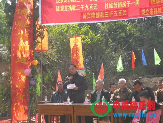 我是这次广西容县饶氏及梅公祠重建活动的发起人。饶先生表示,之所以发起重建广西容县饶氏及梅公祠,是因为我深受到父亲思想的影响。我父亲年轻时代因为家境贫困,被人瞧不起,于是带领全家人艰苦奋斗,顽强拼搏,不干出一番大业不罢休。1984年回国省亲之后,我父亲又说,奋发进取、吃苦耐劳、尊宗敬祖是我们饶氏祖辈的优良传统美德,而今祖祠破旧不堪,待时机成熟,一定要带领族人重建祖祠。30年后的今天,我们终于实现了我父亲的愿望,饶氏及梅公祠的重建顺利动工了。饶氏及梅公祠的重建预算投资40多万元,其中我带个头,捐资十万元,我的两个儿子俊基、鸿基各捐资二万五千元,我妹月兰捐资三万元,我弟超隆捐资一万元,我侄子成基捐资五千元。目前资金已到位38万元。