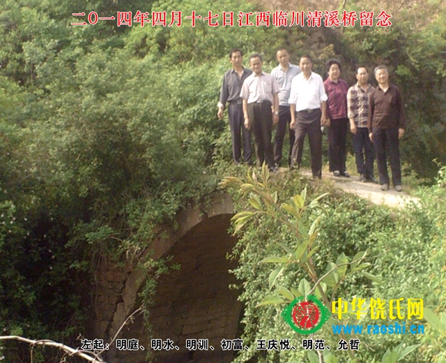 未及村口我们就看到一位精神矍铄的老人站在一座古桥上搭目远眺。不难看出他是在焦急地等待远方的客人。我们一眼就认出这个人就是我们要找的宗亲--饶明水,因为他已接到早祥先生的通知,就早早的来到桥上等待。他脚下“清溪桥”三个字耀眼醒目,记载着六百多年的沧桑历史,虽然风貌依旧,但在阳光的照耀下,好像披上一件金色的外衣。那一刻我们激动的心情无以言表,苦辣酸甜涌上心头。我们大声疾呼:“老朋友,我们阔别了272年,又相会了,你为我们饶门阔别重逢立下了汗马功劳,你是我们的大恩人!”你看她身不大但是凛然,桥不高但是辉煌,因为她是我们多少年多少代亲情的见证。她不但经受了封建社会的苦难与洗礼,更经受了日本帝国主义铁蹄的践踏与蹂躏。在三座大山的压榨下,她这种打不倒、踏不烂、摧不垮、坚强不屈的铮铮铁骨,不正是整个饶门子孙的象征吗?饶明水也认出了我们就是他所等待的人,他亲切的握着允哲的手,用不很流利的普通话问:“走这么远的路累不累?怎么想到来寻亲?”允哲郑重的回答:“我们是带着先辈的重托和心愿来的。根据第十八世祖其义公在1939年《修谱簿序》中记载:‘世祖饶孝齐自江右所带宗谱与清同治元年(即1862年)蟊贼在将军岭宅舍俱焚,祖谱已失厥后本,修谱者欲求谱书必回江右,本人已临饥馑之岁,师旅之加,家无余庆,无法赴数千里而归江右,望后人有德位者,执此回江右以拷谱牒之真传……’,距此又过74载,我已到了花甲之年。老牛自知夕阳短,不用扬鞭自奋蹄,如果在我有生之年不能了确先辈的嘱托,日后九泉之下无颜面对列祖列宗。”我看他面带严肃,语意凝重,赶紧接着打趣说:“我们是‘老年聊发少年狂’,如果能够了确先辈的心愿,苦点累点也值得。”