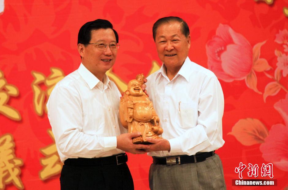 7月23日中午,率团参访台湾的中共江西省委书记强卫,在苗栗县与中华海峡两岸客家文经交流协会理事长饶颖奇会面。图为饶颖奇(右)向强卫赠送纪念品。中新社发 林永传 摄