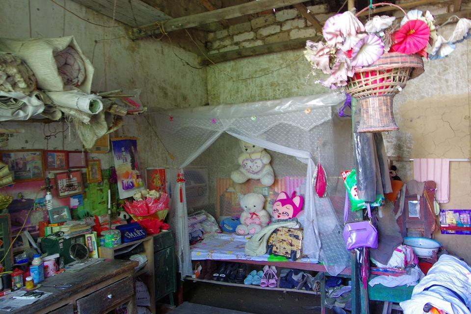床上有一些布娃娃,看得出这是个活泼开朗的小姑娘,老人家看到我们拿相机和摄像机在拍,他也拿出了小姑娘之前拍的一些生活照给我们看