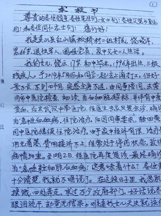 生活刚现喜色,然而,不幸再次来临。九月初,饶云所在的打工单位组织体检,经常头昏体乏的她被查出患有急性骨髓性白血病。养父饶小平已经66岁了,家徒四壁,无力担负起这几十万元的医疗费用。
