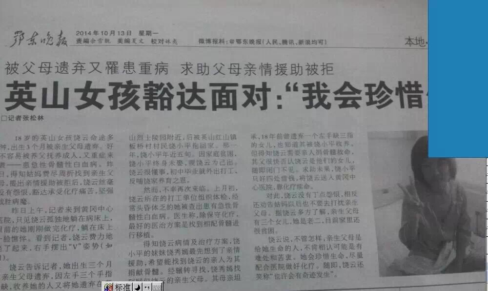 10月16号,饶氏宗亲会正式发动倡议,为英山白血病女孩饶云爱心捐款活动正式启动!望饶氏宗亲伸出援手!救救饶云宗亲!献出一份爱心!