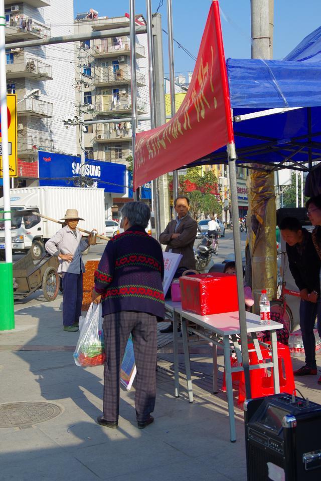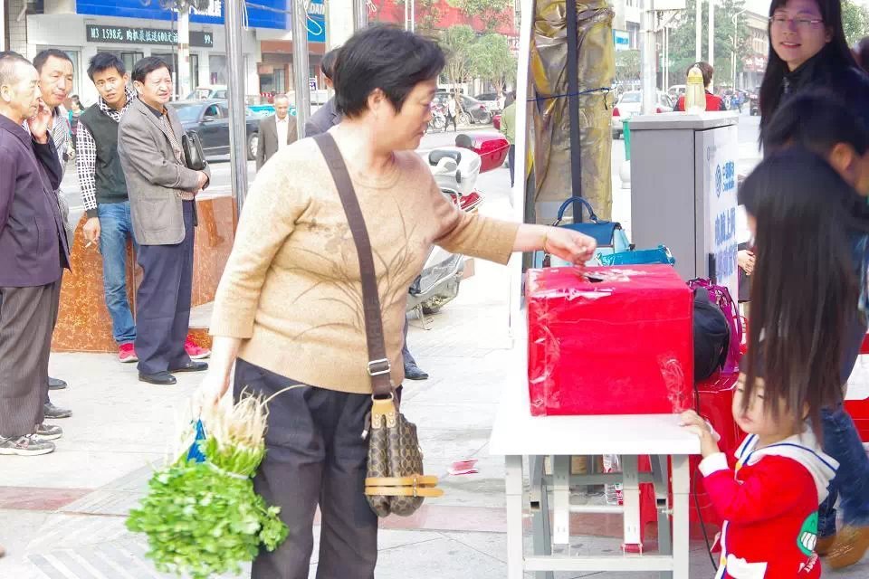 早上从菜市场买菜回家的老太太也来奉献爱心