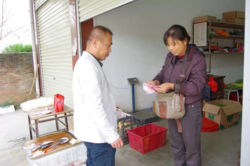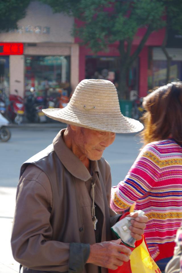 上图左边的老人家在做什么呢?。。。。。在一个食用盐的袋子里面摸出钱来!