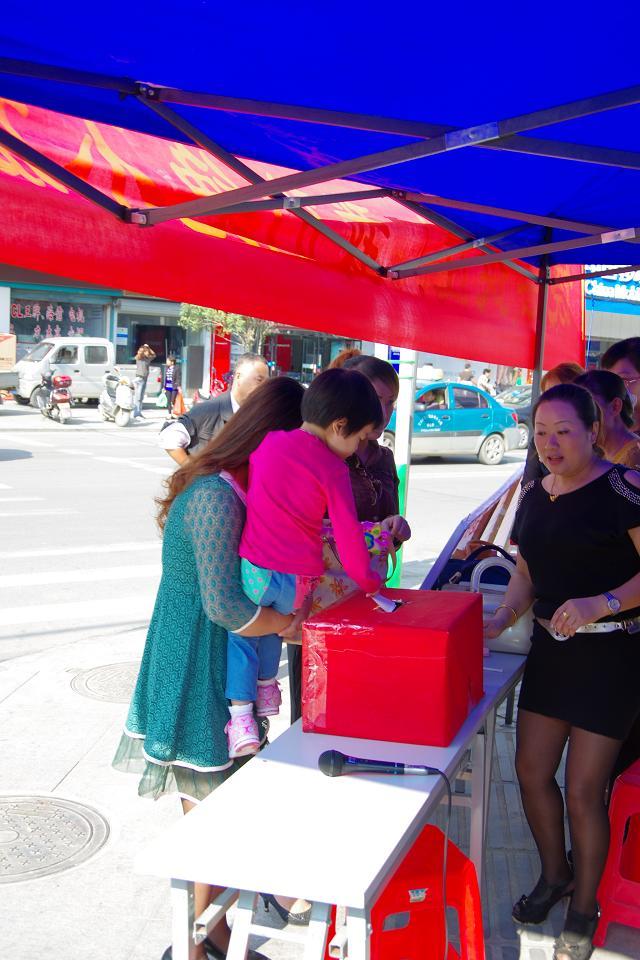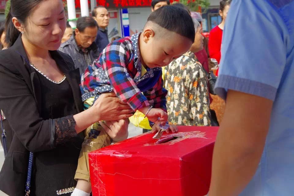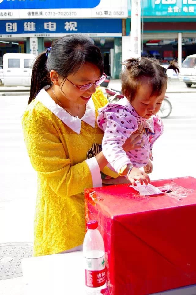 懂事的孩子小心翼翼的把捐款放进募捐箱里面