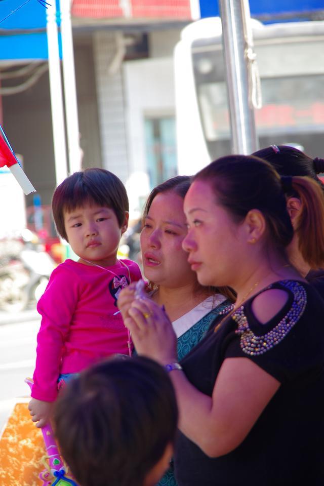 一对年轻的夫妇带着孩子在广告牌前,妈妈蹲着和孩子耐心的说着什么。。。。