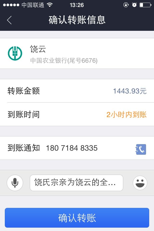 虽然本次捐款无法解决饶云的病情,但宗亲的深情厚意,会一定程度上解决他们的燃眉之急,会鼓励饶云战胜病魔的信心,让她感受到饶氏大家庭的温暖。本次宗亲所捐的善款总共是21443.93元,转交了二万元后余下的1443.93元,将由饶扬庆通过转账的方式,将善款余额转到饶云的帐户上的,并在网站上公示转账截图。