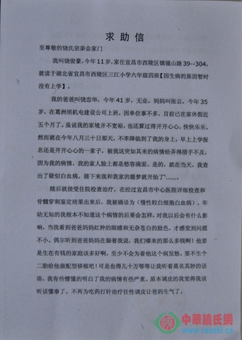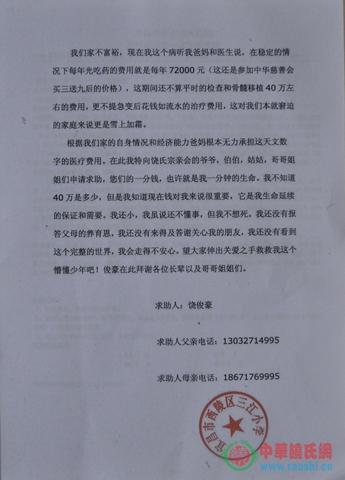 根据我们家的情况和经济能力,爸妈根本无力承担这天文数字的医疗费用。在此我特向饶氏宗亲会的爷爷、伯伯、姑姑、哥哥、姐姐们申请求助,您们的一分钱,也许就是我一分钟的生命。我不知道40万是多少,但是我知道现在钱对我来说很重要,它是我们生命延续的保证和需要。我还小,我虽说还不懂事,但我不想死。我还没有报答父母的养育恩,我还没有来得及答谢关心我的朋友,我还没有看到这个完整的世界,我会走得不安心。望大家伸出关爱之手救救我这个懵懂少年吧!俊豪在此拜谢各位长辈以及哥哥姐姐们。