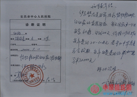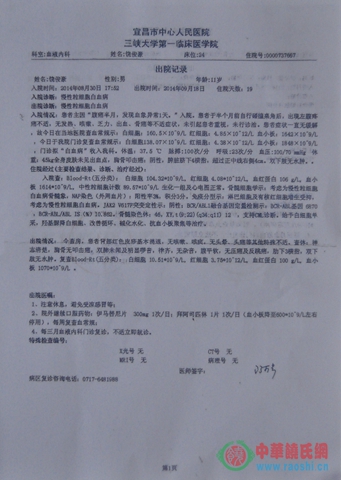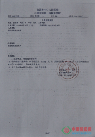 随后就接受住院检查治疗,在经过宜昌市中心医院详细检查和骨髓穿刺鉴定结果出来后,我被确诊为“慢性粒白细胞白血病”。年幼无知的我根本不知道这个病情的后果会怎样,对我以后会有什么影响,当我看到爸爸和妈妈红肿的眼睛和无奈苍白的脸色,才感觉到问题不小。偶尔听到爸爸妈妈在躲着我说,我们哪来的那么多钱啊!他要是生在有钱的家庭该多好啊,至少不会为看他这个病发愁。要不生个二胎给他做配型移植吧!可是也得几十万等等,让我听着莫名其妙的话语,我有些懵懂的明白了我的病情有些严重。原来调皮的我觉得我该听话懂事了。不能再为吃药打针治疗而任性调皮让爸妈生气了。