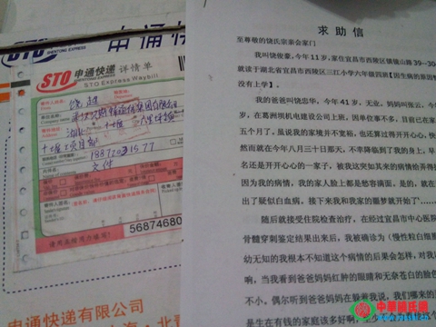 由于双十一快递的阻塞,本该数天就拿到的快递一波三折,今天,终于看到了由湖北十堰饶超转来的一封快递。这是一封求助信,是一封由一个无助的家庭发出的救命信,是一封包含着一位十一岁少年无声呐喊的来信……