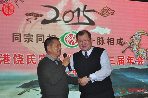 年会集报告会、答谢会、娱乐会为一体,程序简洁,但内容丰富,意义深刻。年会由饶道肖会长作联谊会2014年工作报告,由饶大作宗亲作2014年财务工作报告。饶及人宗亲在致辞中,以高度的视角阐述了小姓办大事,以及小姓氏的优势所在;他再次指出我们能够相聚,能够为家族办事,说明我们有一个健康的体魄、有足以确保生活的能力、有一个支持自己的和睦家庭,这是祖上有德,惠及我们子孙;他还通报了商会近期的一些工作;他最后表示,只要有时间,他都非常乐意参与饶氏宗亲的聚会。饶洪桥将军讲话开始,即向与会宗亲深深地鞠了一躬,感谢受邀参加龙港年会,也表示对龙港宗亲的敬意,这次偕夫人同行,主要来感受一下宗亲间的浓浓亲情,他高度赞扬了苍南龙港宗亲这种团结一致的宗亲情,以及他们所取得的成绩。饶玉华会长高度评价了龙港宗亲团结奋斗、吃苦耐劳的精神,感谢龙港宗亲以及苍南藉宗亲对第三届饶氏文化研讨会的支持,从而开创了饶氏宗亲事业的良好局面,苍南龙港饶氏不仅是浙江的一面旗帜,也是全国的一面旗帜,值得全国宗亲的尊敬和学习。因受到航班延误,来自云南的原重庆高炮师政委饶素平宗亲匆匆来到会场,他说自己是第二次参加如此规模的聚会,来到龙港,他的感触很深,他非常认同及人宗亲讲的小姓办大事,他说我们还要小兵立大功,只要大家团结起来,任何困难都不怕。几位重量级宗亲的讲话,鼓舞了全体宗亲,共同为“饶”而感到自豪。大家纷纷表示,要相互帮助、相互扶持,相信饶氏的明天会更好。