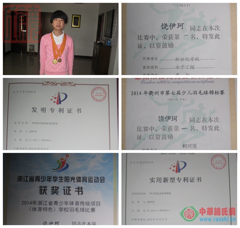 饶伊珂今年才十几岁,是初中一年级的学生,从小在其父母的影响并鼓励下,充分发挥自己的奇思妙想,几年来获得多项发明专利,是一位爱动脑并心灵手巧的女孩,她的事迹已经被当地媒体报道。她还是一位羽毛球高手,获得多次省市相应组别的冠军。目前,饶伊珂就读于衢州一所著名的中学,我们希望她能够继续获得好成绩,为她自己和家人,为饶氏家族争光。我们为她骄傲,也祝愿她在成长的道路上继续取得更好的成就。
