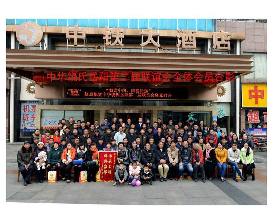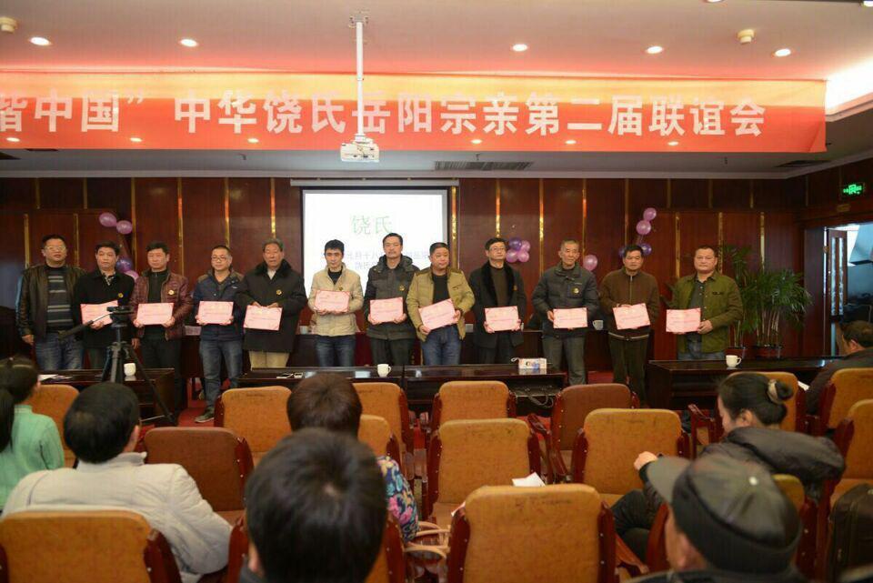 饶氏岳阳宗亲联谊会到场的有湖南省分会会长饶悌清、湖南分会副会长饶春如、湖南城步名誉会长饶希寿、浏阳饶氏族长饶保成、平江联谊会荣誉会长饶铁基、平江联谊会会长饶锦才、湖北赤壁宗亲代表饶志华、湘阴县宗亲代表饶国华、饶朋辉及各地宗亲。会议开始由饶铁基宗亲致欢迎辞,铁基宗亲有句话记忆深刻,他说“今天我们岳阳饶氏宗亲在这里聚集,除了联络感情外,更重要的是共商致富之路、交流生财之道。希望各位宗亲畅所欲言,献计献策,为了振兴家族贡献力量、奉献精神。开创新局面,在各自的岗位上做出成绩,为振兴中华、为家庭幸福而努力奋斗!”。