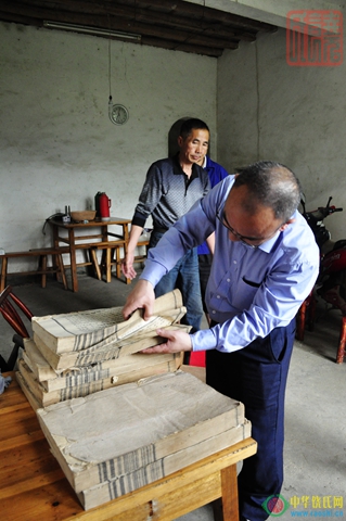 饶明水宗亲今年六十多岁,居住在这青山怀抱的地方,与世无争,怡然自得,看上去更像一位有一定修为的长者,颇有气度。由于事先联系,饶明水宗亲已经在家等待。我们到了之后,略为寒喧,就直奔主题,动手架设拍照设备。虽然首次见面,还是饶家人那种特有的情感,没有生分,明水宗亲和陪同我们去的泉生、钦华宗亲,从楼上抬下一只大木箱,他们这支的藏存下来的族谱都装这只箱子里。