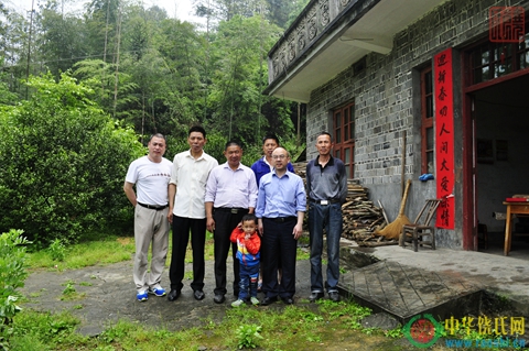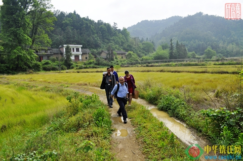 次日上午,通过20分钟左右的高速车程,即到达了澧溪镇岩山村,再沿着一条正在大修而崎岖颠簸的省道,再开入一条两车交汇都显困难的水泥小道,直到尽头,再接下来的一段机耕路只能徒步进入。翻过一座小山冈,里面有个平畈,有豁然开朗的感觉,我们饶家人就住在这里,这就是当地族谱编委饶明水的家。虽然这里有他们兄弟几人的房子,但目前只有饶明水夫妇住于此。这是一座建于九十年代的砖瓦房,背靠青山,掩映在巨大的古树下,构成了一幅人与自然的和谐景象。