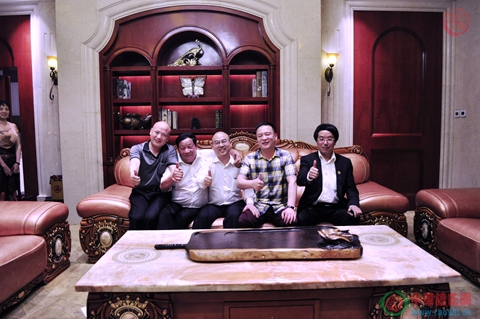 宾主要产业园门前合影,左四起饶洪仁、饶辉、饶玉华、饶明芳、饶新民、饶玉梁