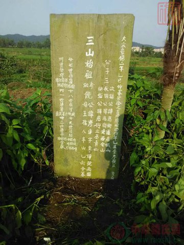 这是我们界山的始祖墓,墓碑很大,是“三山始祖”墓,根据墓碑所书,始祖是在宋景德二年从抚州临川述陂里迁来丰城开基,有三个儿子,老大迁居界山,老二迁居低山,老三立基青山,古墓是始祖及其三子的合墓,此碑为同治四年(1865)岁次乙丑年所立。对于碑上记载,我曾查阅界山祖谱,低山、青山村没有任何记载。进贤县界岗是彦立的十一世孙,而界山是彦明的九世孙世显公开居。为了解开这个谜,我到处考察走访,去新建县西山镇走访,他们祖宗的名字和我界山谱上的一模一样,从谱上看,西山是界山迁过来的准确无误,还有青山村再过去二里路是塔下村,还有破江村谱上也有记载去开基。去破江走访联谊,是有人说兄弟不和,看来并非凭空捏造。现在湖南城步宗亲和河南台前饶崇生一行也都去看了墓基,以及省分会副秘书长饶洪仁和万年饶垂智宗亲,都判断可能是三兄弟不和睦,闹矛盾,各修各谱没有统一的原因,造成谱上缺少记载。