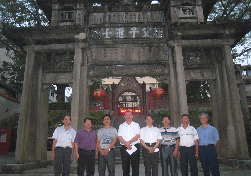 父子进士牌坊前合影:从左至右饶建祥、饶和平、饶颂华、饶及人、饶洪桥、饶仁河、饶高浪、饶宝忠。