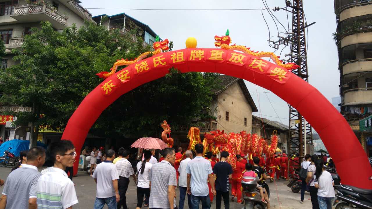 在广场里队伍排列完毕,双龙起舞,尽显吉祥之瑞兆。金龙围绕祖牌旋转起舞,尽显对祖宗的敬仰之情,接牌仪式完毕,队伍遊绕老城区一周,回归东安老祖屋,沿路群人驻足观望,行人惊现奇容,称赞饶氏族人尊祖敬宗,排场体面,可为当今世人之楷模。