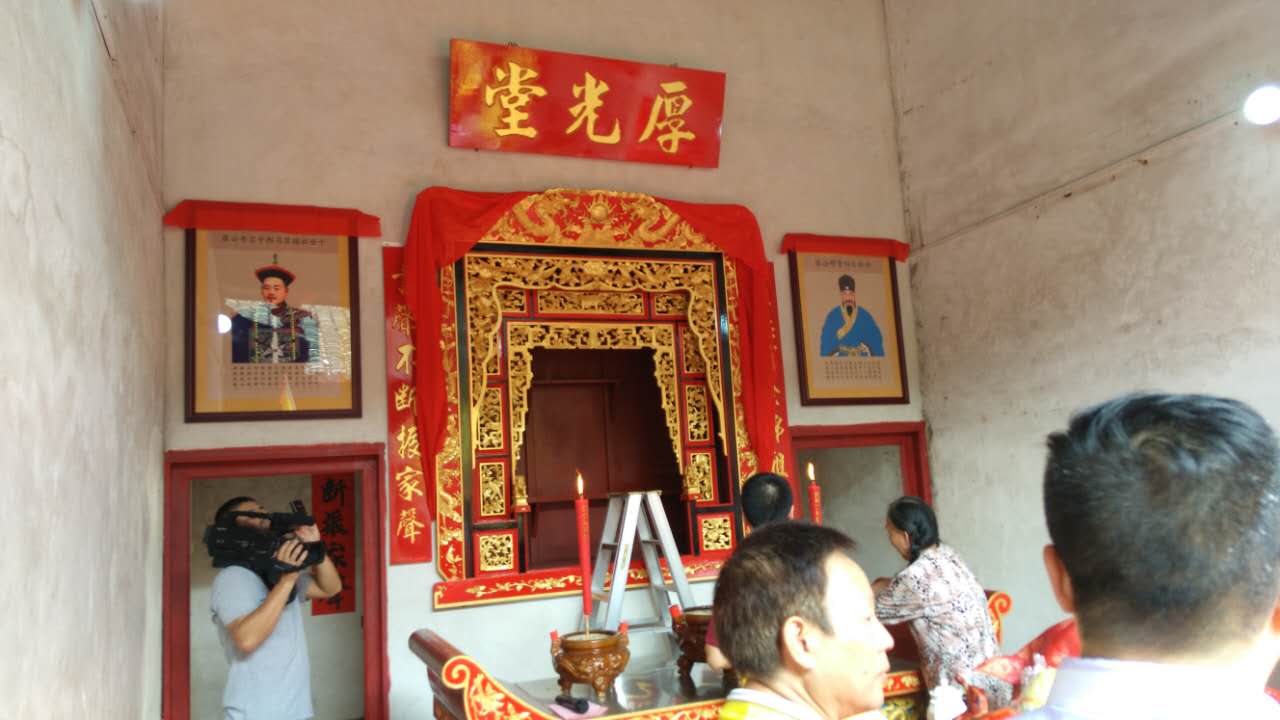 中午十一点吉时时分,祖宗牌登位仪式开始,只见礼官唱赞:2015好年皇,地红长长铺上堂,迎请祖灵升祖座,欢欢喜喜进祠堂,裔孙孝敬齐礼拜,猪羊美酒敬祖上,苍天佑我厚光堂,从此全族丁财旺。奉香仪式、敬三性、果品、美酒完毕。
