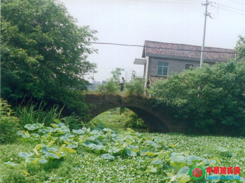 (图八:单孔麻石古桥,当地人叫驼背子桥国平宗亲告诉我们古代的桥是有生命的,还指着桥上一块条石告诉我们是桥胆,里面可能藏有古代钱币)