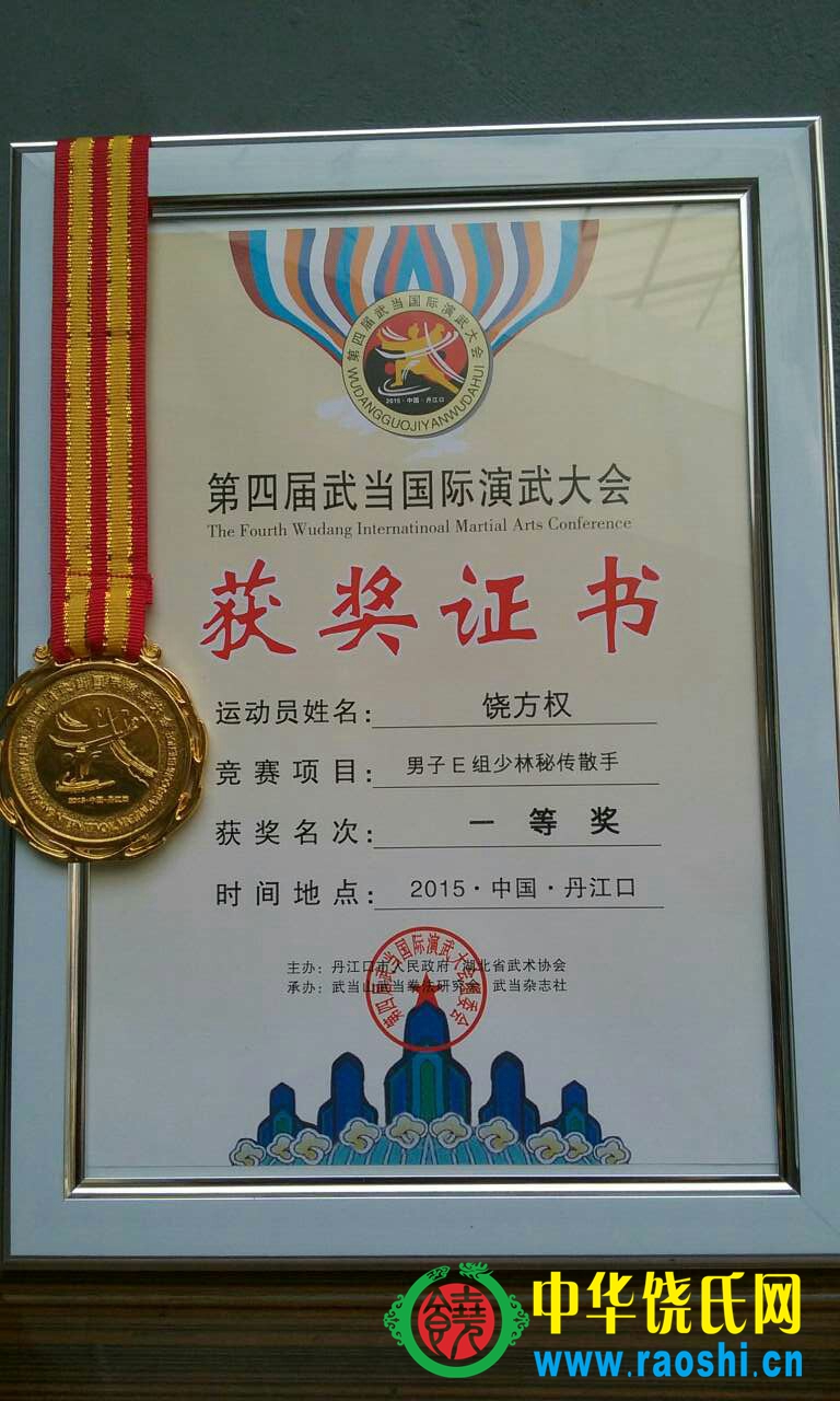 中华饶氏总会常务理事、安徽分会筹备组负责人饶方权宗亲参加了演武大会。饶方权宗亲自少习武于少林,后入伍参军,现任宣城市武术协会常务副主席、竞技委员会副主席、咏春拳馆顾问等职,专业从事安保管理工作。多年来,方权宗亲对武术痴心不改,坚持不懈,颇有建树。本次参加的是男子E组比赛,其演练的“少林秘传散手”获得了一等奖,可喜可贺。