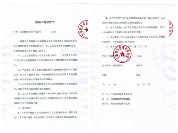 江西饶氏投资有限公司工商登记地在南昌,注册资本金一亿元,经依法批准后可在任何领域实施项目投资。由于江西饶氏投资有限公司肩负振兴饶氏的重任,公司决策者对投资十分慎重,保证投资安全,把风险降到最低,为此,饶明芳、饶辉、饶新民、饶玉喜四位企业家承诺为公司投资的最低收益兜底,确保公司股东最低年收益为20%,并且将其列入《投资入股协议》。这不仅表明了公司决策者的决心和气魄,也为宗亲的入股投资增添了信心,而对于本身办有企业的宗亲来说,更大的利好是有优先向公司提出融资的权利。公司高回报、低风险的特点,为有闲钱或有意向投资的宗亲带来了难得的机遇。
