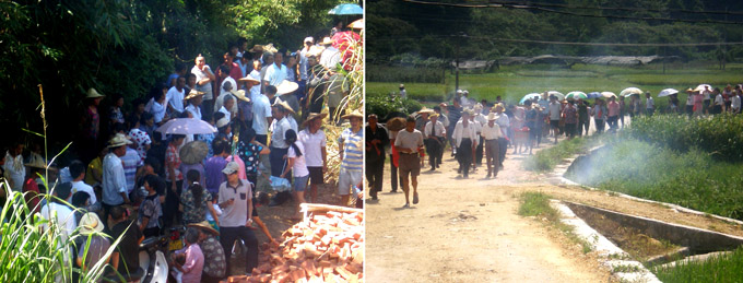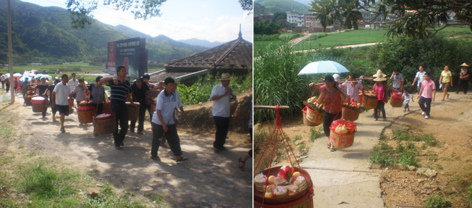 上图左为排队等候向永和公墓上香的村民;上图右为敲锣打鼓和所有有新丁挑着鸡、鸭、鱼、猪肉等供品向永和公墓出发。