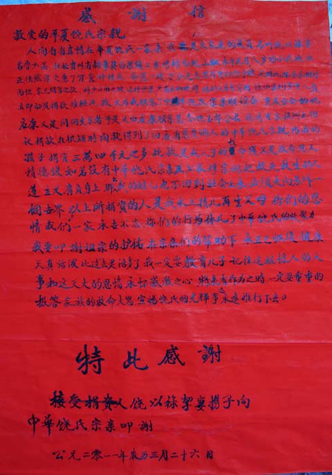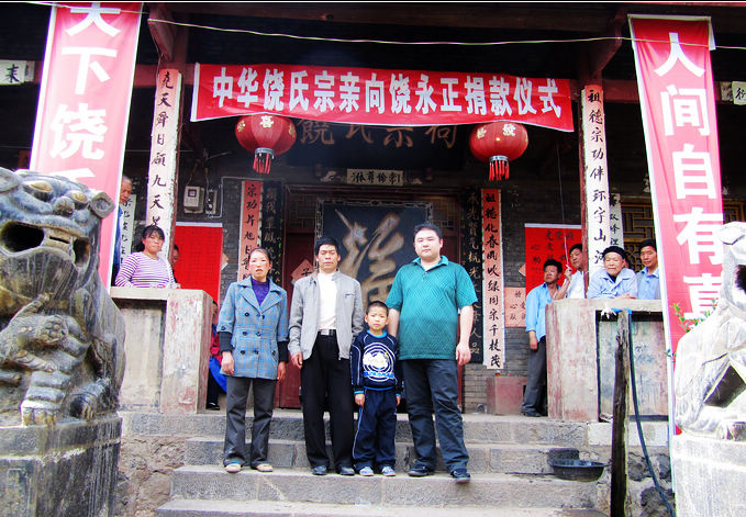 下午,“中华饶氏宗亲向饶永正捐款仪式”在饶氏宗祠庄重举行。祠堂大门贴上了“人间自有真情在,天下饶氏一家亲”的对联,祠堂门前的绿化院里坐满了饶氏族人。七家湾饶氏宗族族长饶天然宣布:“中华饶氏宗亲向饶永正捐款仪式”开始。在叩拜祖先之后,七家湾饶氏祠堂管理组代表饶之凯等做了简短讲话,对全国宗亲对饶氏后人的关怀和帮助,表示了由衷的谢意。而受捐赠人饶永正小宗亲的父亲饶以禄宗亲,也被饶宇宗亲带来的全国宗亲的慰问和关怀深深的感动。文化程度不高、不善言辞的饶以禄宗亲虽然没有说出多么华丽的语言,但他朴实和真情让每一个在场的宗亲都热泪盈眶。虽然整个仪式受经济条件限制显得非常简朴,但是众宗亲的热情、凝聚力确深深的感动着饶宇。饶宇宗亲代表全国饶氏宗亲、饶氏宗亲会在仪式上讲了话。饶宇勉励饶以禄要振作、要劳动致富,要不辜负全国宗亲的一片爱心,把每一分钱用在饶永正的治疗上,祝福饶永正早日恢复健康!同时对七家湾宗亲的热情迎候表示感谢!