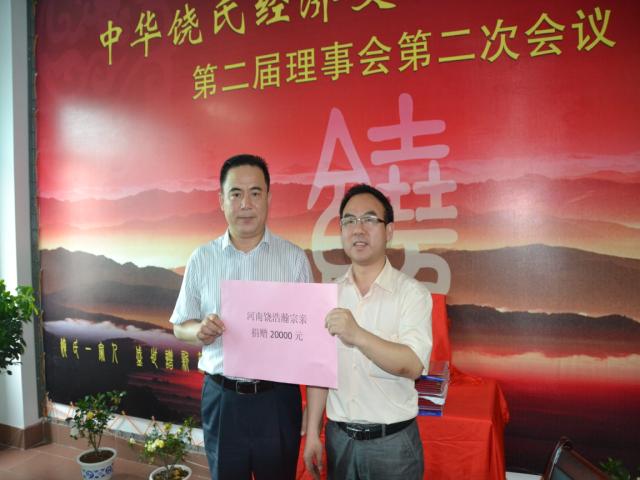 河南浩瀚宗亲(左)向基金捐款现金2万元。