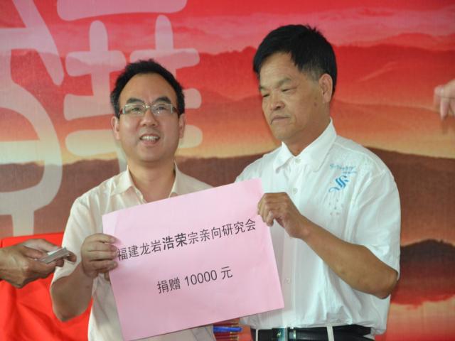 福建饶荣坤宗亲(右)代表饶浩荣宗亲为基金捐资现金10000元。
