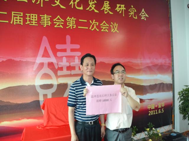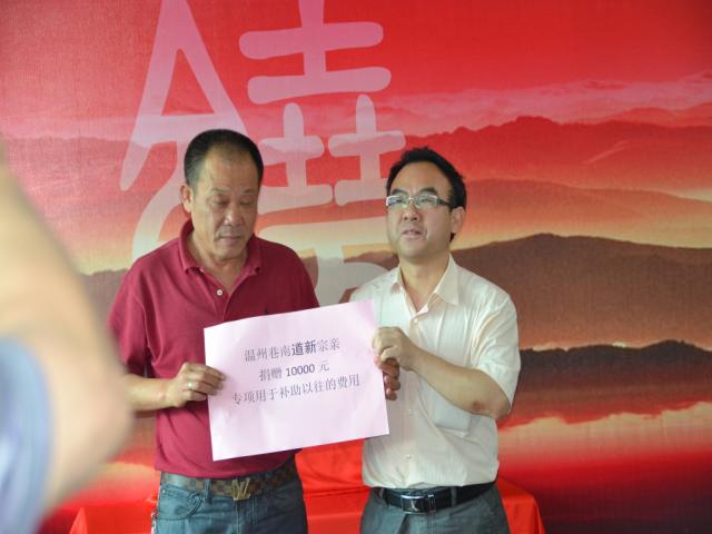 浙江饶道望宗亲代表苍南宗亲为基金捐款现金10000元,图为代表山东(原籍浙江)道新宗亲捐资1万元。