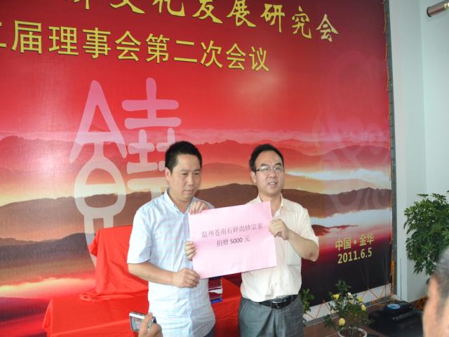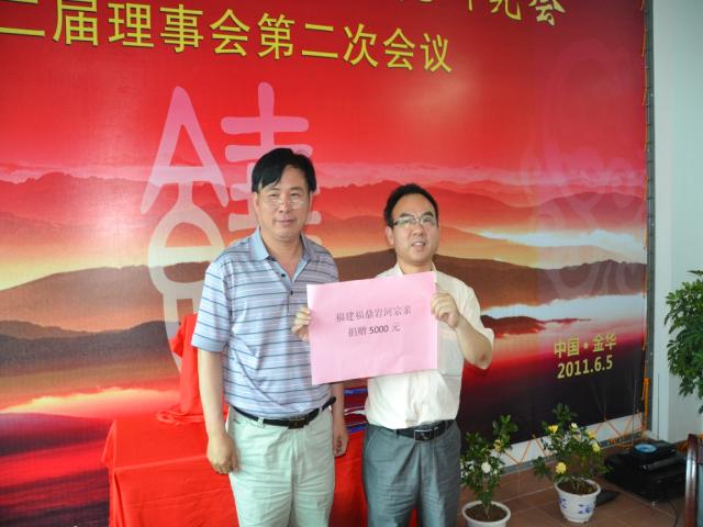 上海(原籍浙江)宗亲饶尚宠(左)为基金捐款3000元,图为代表山东(原籍浙江)宗亲尚钞捐款5000元。