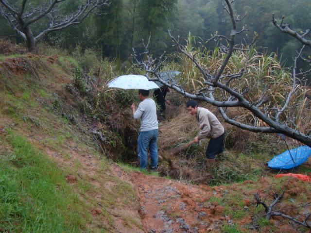 我们在下饶村一帮年轻宗亲的陪同下,来到上饶屋后的下饶饶氏祖墓地。十余座祖墓就坐落在上饶家村的后屋的山坡上,一片梨树林之中。宗亲们手拿锄头柴刀,劈光了墓前的杂草,清理了祭祖的场地。