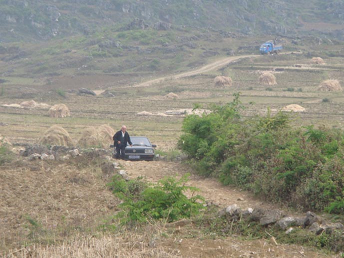 2007年4月13日,饶铁、饶文生一行,在贵州族人饶骁的热心陪同和带领下,艰难行进在贵州省贞丰县仙洞村的路上,去看望饶氏宗亲,因路面严重不平,人只能下车步行,才能保证车子免强前进,少被路面上的石块刮底,